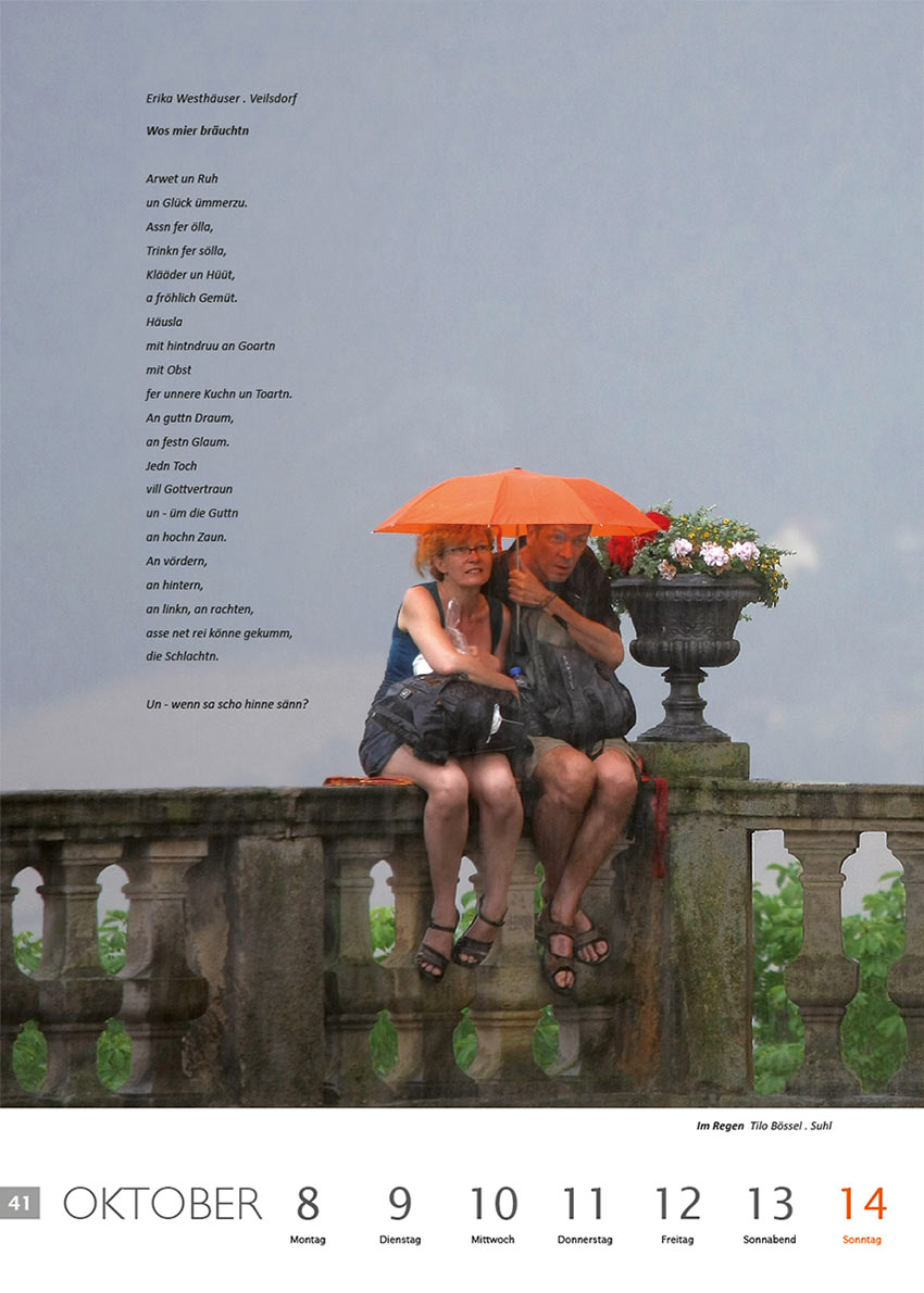 Wos mier bräuchtn (Text: Erika Westhäuser) | Im Regen (Foto: Tilo Bössel) . Literaturkalender Thüringer Ansichten 2012