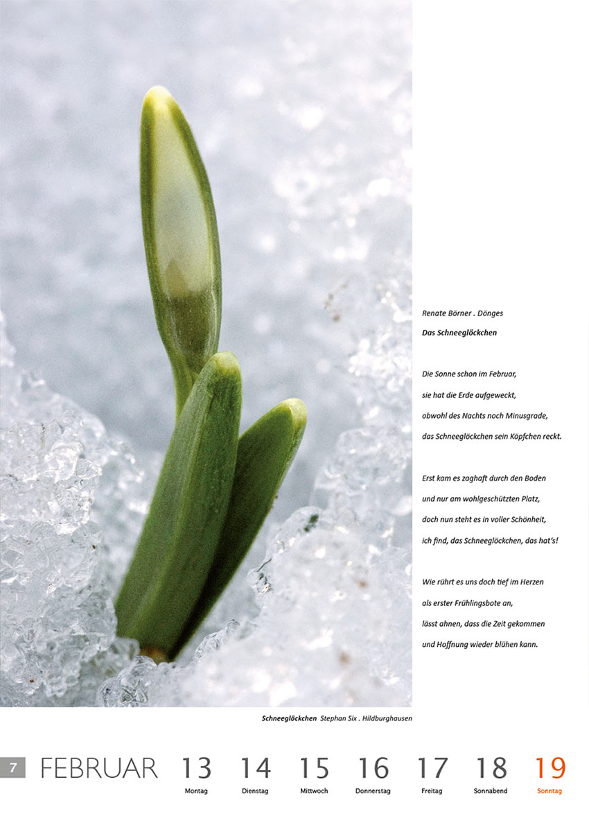 Das Schneeglöckchen (Text: Renate Börner) | Schneeglöckchen (Foto: Stephan Six) . Literaturkalender Thüringer Ansichten 2012
